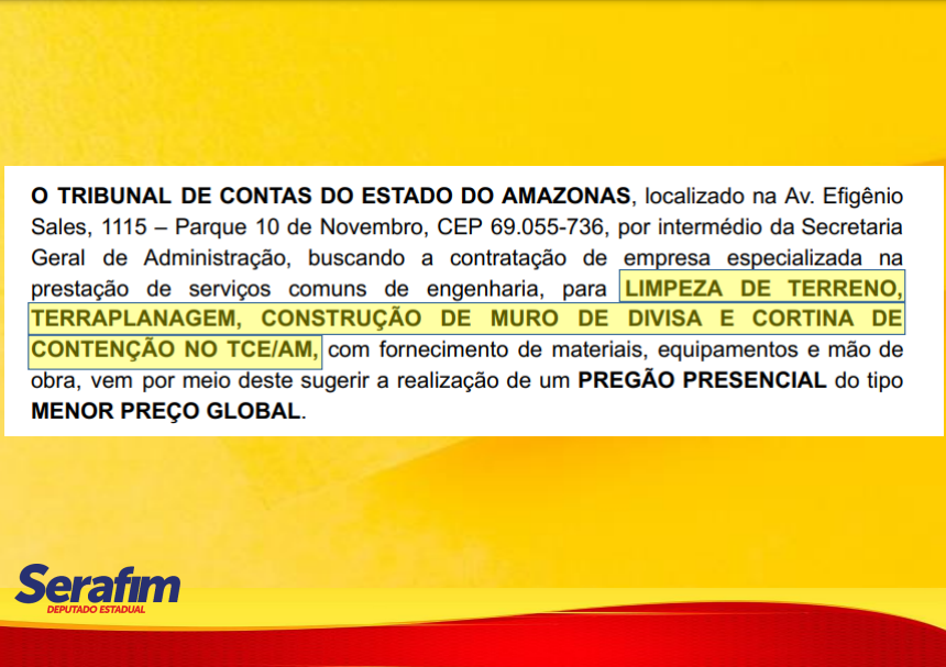 Em setembro, relembra o deputado, o governo do Estado encaminhou à Assembleia Legislativa do Amazonas um projeto de lei pedindo autorização para abrir crédito especial de R$ 1 milhão no orçamento vigente para a construção de um prédio anexo do TCE-AM. Questionado por Serafim, o Tribunal esclareceu que o recurso seria para a limpeza de um terreno. Após o episódio, o governo, a pedido do TCE, retirou, no dia 29 de setembro, o projeto de tramitação.